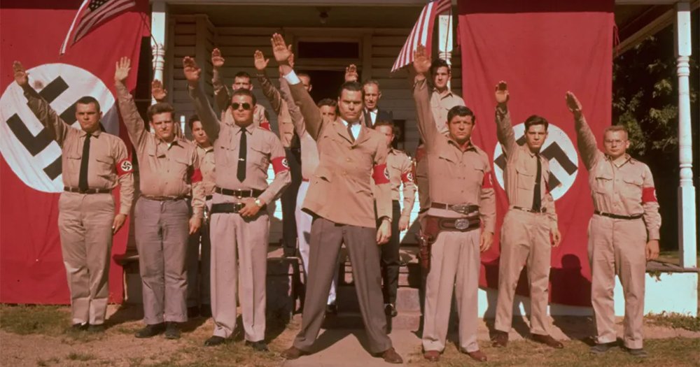 Dan Burros a borítókép jobb szélén egy 1960-as fotón az Amerikai Náci Párt tagjaival, középen a párt vezetője, George Lincoln Rockwell – Fotó: Lee Lockwood / Getty Images