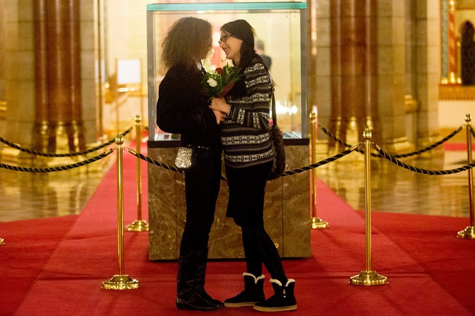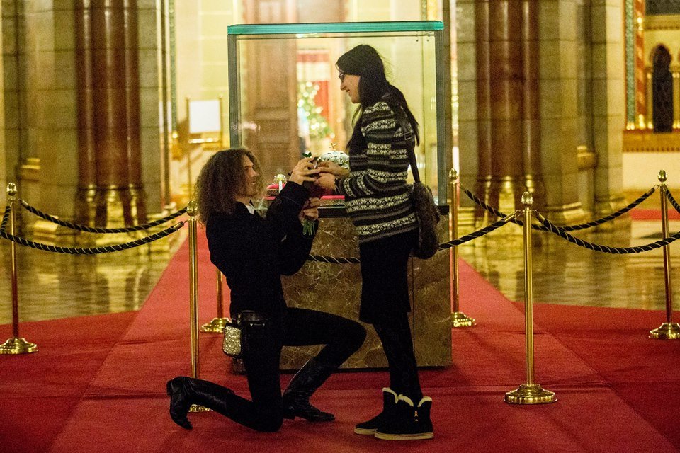 Éppen a Szent Koronát és a csarnokban található uralkodói szobrokat csodálta, és fel sem tűnt neki, hogy István már melléosont. Csak akkor vette észre, amikor a székely legény már letérdelt kezében egy csokor virággal és egy gyűrűvel. A válasz természetesen igen volt, így a valóban romantikus és egyben megható történet tökéletesen végződött.