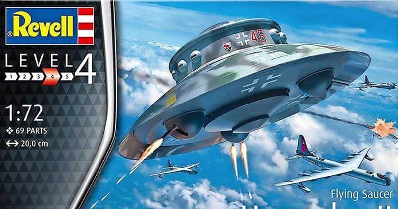 A Harmadik Birodalom jelképeit viselő repülő csészealj készítői terméküket úgy reklámozták, mint „az első olyan eszközt, amely képes az űrben repülni”.