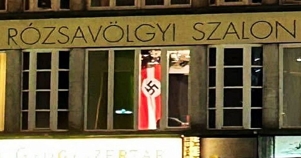 De mégis. Az elmúlt napokban az izraeli közösségi oldalak felháborodva, döbbenettel számoltak be arról, hogy a budapesti kormányzati propagandával ellentétben a magyarok ismét kimutatják a régi, a nyilas és náci énjüket: Budapest központjában, a turisták által igen kedvelt Belvárosban ugyanis egy felvont „náci zászló” kandikál ki egy első emeleti ablakból a forgalmas utcára.