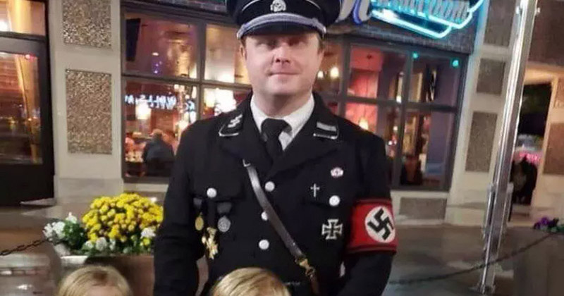 Jelen esetben azonban ez kétes dicsőség, Goldbach ugyanis SS-katonának öltözött, ötéves kisfiát pedig Adolf Hitlernek maszkírozta – írja a Newsweek.