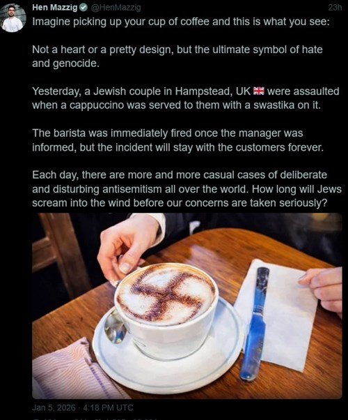 "Képzeld el, hogy átveszed a kávédat, és ezt látod: Nem egy szív vagy egy szép dizájn, hanem a gyűlölet és népirtás végső szimbóluma. Tegnap egy zsidó házaspárt Hampsteadben, az Egyesült Királyságban megtámadtak, amikor egy cappuccinót szolgáltak fel nekik, amelyen horogkereszt volt. A baristát azonnal kirúgták, miután értesítették a vezetőt, de az eset örökre a vendégekkel marad. Nap mint nap egyre több véletlenszerű és aggasztó antiszemitizmus jelenik meg világszerte. Meddig fognak még a zsidók kiabálni a szélbe, mielőtt komolyan veszik az aggodalmainkat?"