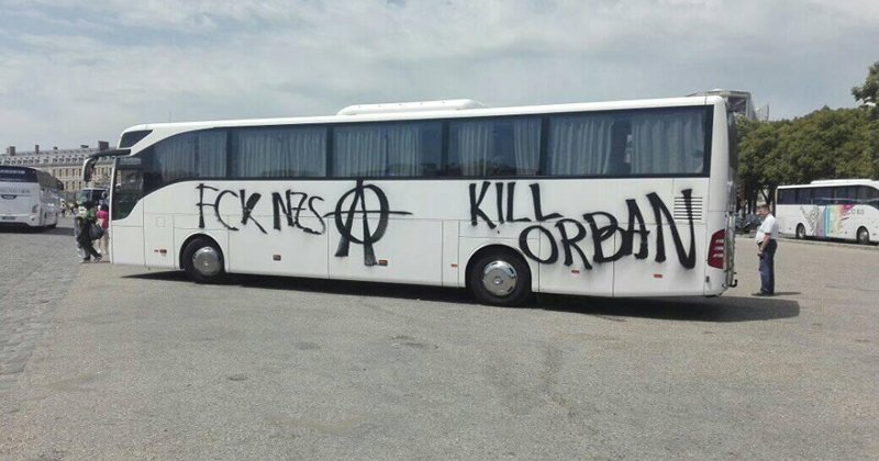Ilyen szöveggel rongáltak meg egy magyar buszt a német szélsőbaloldaliak. Még egy anarchista jellel is ellátták.