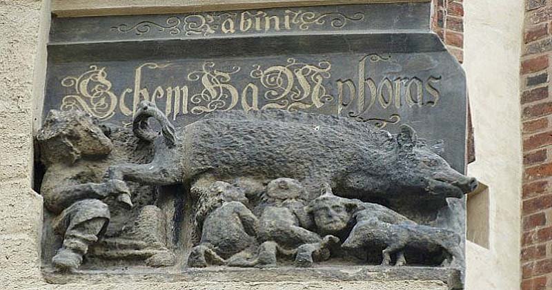 A Zsidó disznó (Judensau) dombormű egyike a németországi és európai templomok falán a középkorból fennmaradt több mint 20 hasonló szobornak. A templom falán lévő dombormű egy disznót ábrázol, amelynek farkát felemeli egy rabbi, és a koca emlőin zsidók szopnak. 1570-ben a reformáció meghirdetése után egy Luther Mártonnak tulajdonított zsidóellenes feliratot is mellékeltek hozzá.