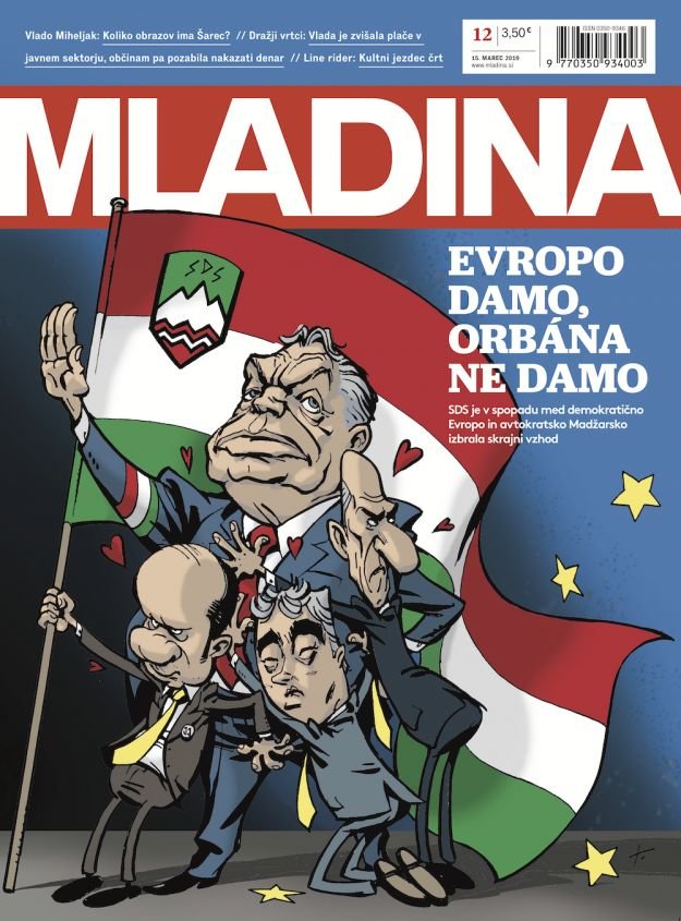 A címlapon középen Milan Zver az SDS EP képviselője jelenik meg, aki számtalanszor kiállt Orbán és a Fidesz mellett, jobbra pedig Janez Jan±a tűnik fel: az SDS elnöke, Orbán barátja. A karikatúrán megjelenő szlovén lobogó magyarosítása Szlovénia orbanizálódásának "kétségkívül valós veszélyére" figyelmeztet - írja elégedetten a csak nevében Magyar Narancs.