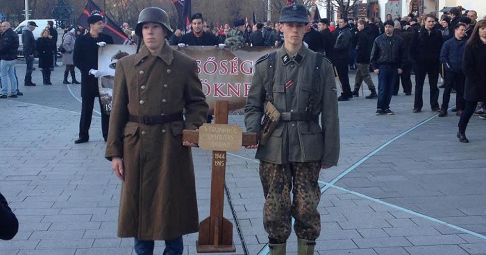 A vádlott a nyomozás adatai szerint a megemlékezésen a Hotel Magyar Királytól a Kossuth utcában lévő fekvő katona szobráig a nagy nyilvánosság előtt a menet élén haladva a második világháborúban a német hadseregben rendszeresített olyan egyenruha kabátot viselt, amelynek gallérján önkényuralmi jelképnek minősülő SS-jelvény volt.