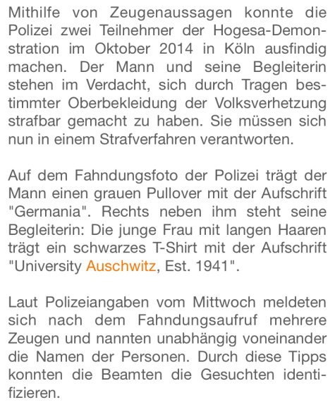 aki a különféle egyetemi ruhadarabok mintájára elkészített University Auschwitz, Est. (jelentése: alapítva) 1941 feliratú pólóban jelent meg egy kölni focihuligán-tüntetésen. A cionista német gyarmat rendőrsége ezt persze nem hagyták annyiban: a felhívásukra önként jelentkező tanúk (spiclik) segítségével beazonosították a párt, büntetőeljárást indítottak ellenük, és most bíróság előtt kell felelniük "gyűlöletkeltő" viseletükért.